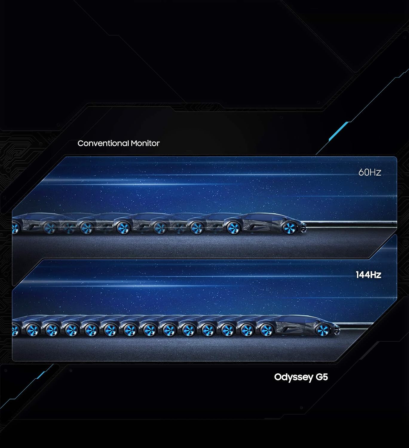 - EXPRESS 144Hz REFRESH RATE: More than double your potential frame production, with the Odyssey G5. With a 144hz super smooth refresh rate, you’ll never want to go back to a traditional screen