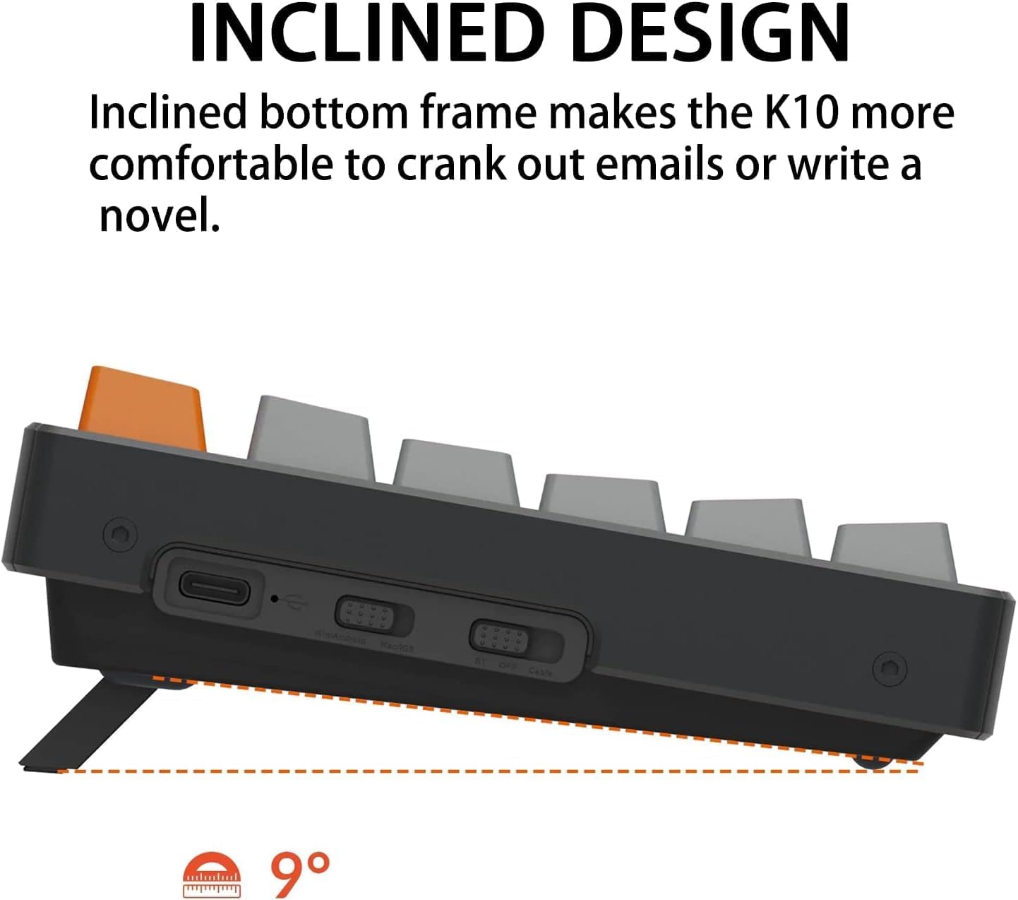 inclined bottom frame provides a great ergonomic support for long lasting typing