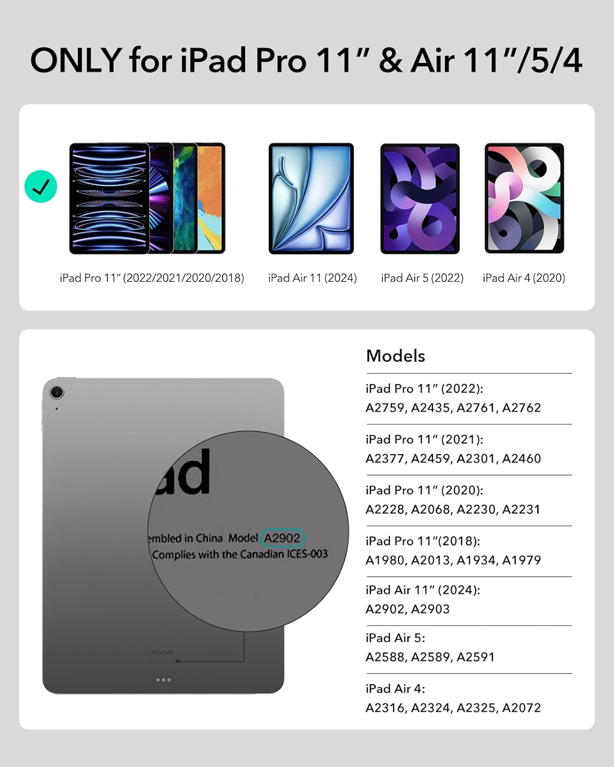 - Compatibility: only compatible with iPad Air 11 inch(2024), iPad Air 6th Generation (2024), iPad Pro 11 inch (2022/2021/2020/2018), iPad Air 5th Generation (2022), and iPad Air 4th Generation (2020); models A2759, A2435, A2761, A2759, A2435, A2761, A2316, A2324, A2325, A2072, A2377, A2459, A2301, A2460, A2068, A2228, A2230, A2231, A1980, A2013, A1934, and A1979