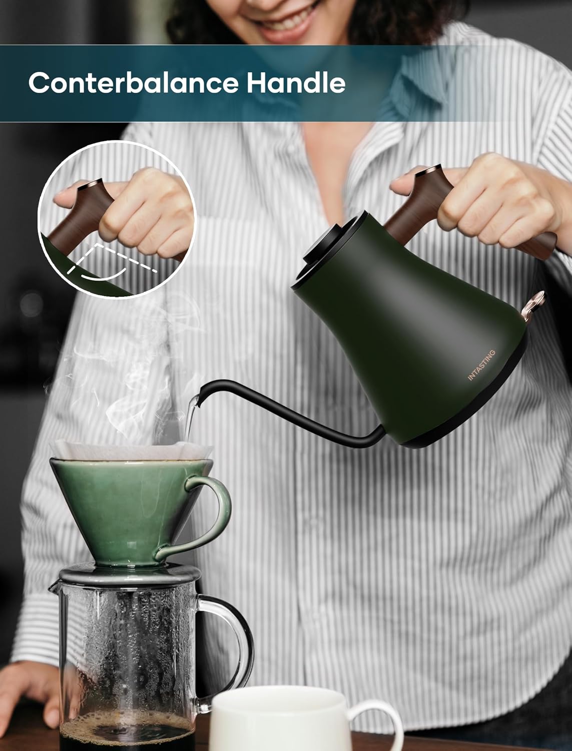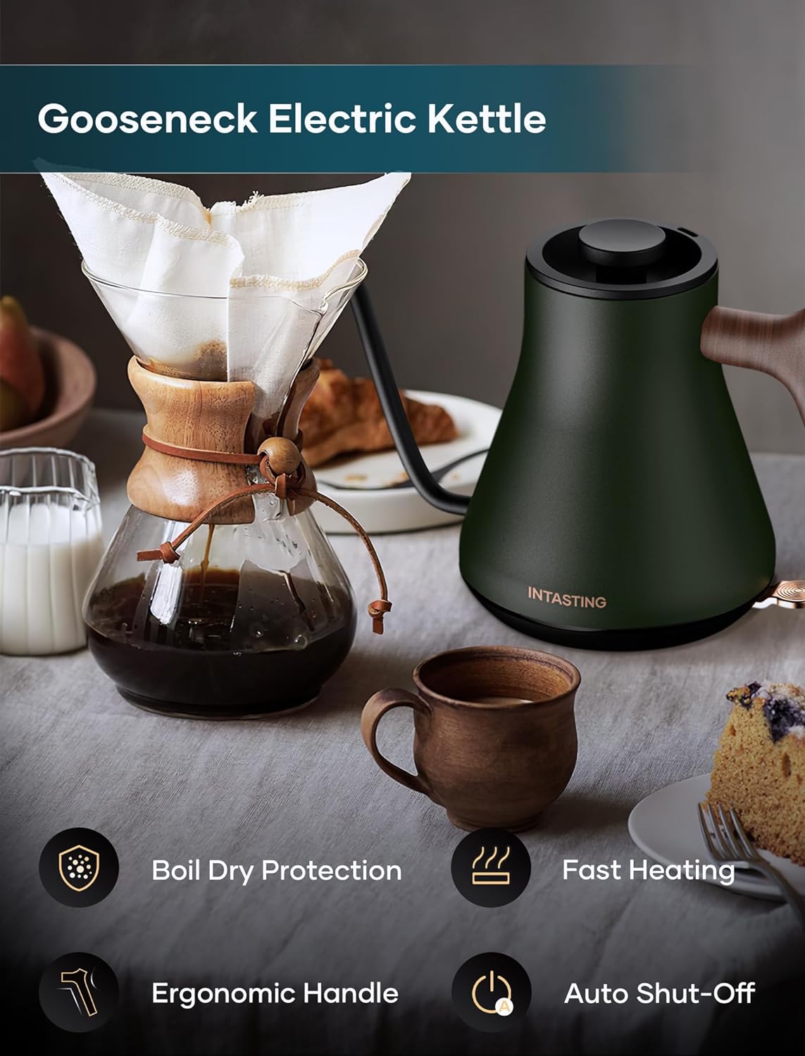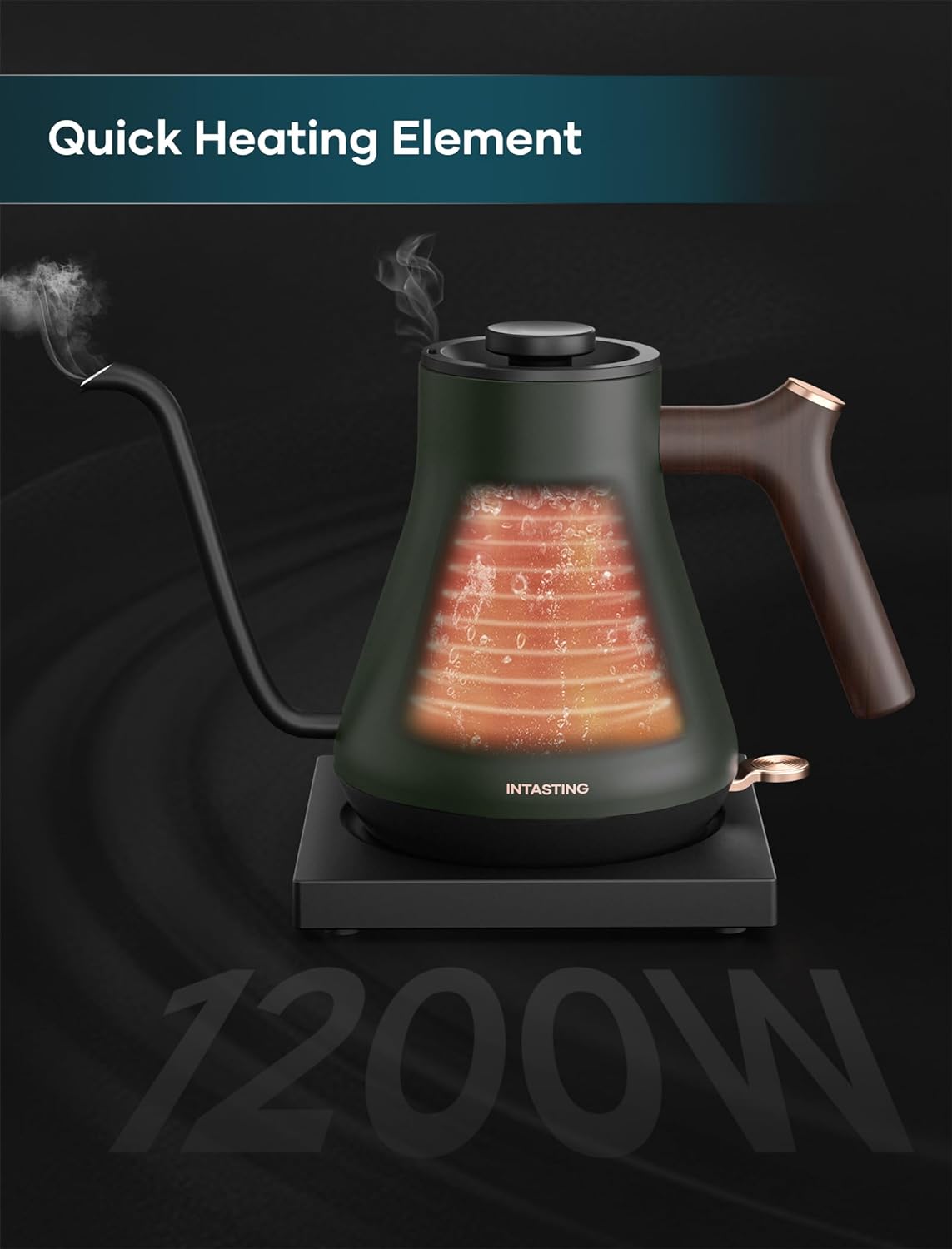 INSTASTING Electric Professional Gooseneck Kettle 0.65mm Ultra-Fine Sprout (0.9L/30oz) - Auto Shut-Off, Boil Dry Protection - Matte Green w/ Dark Brown Handle