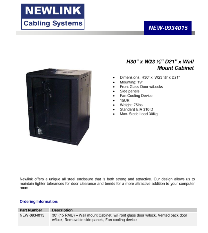 Newlink 15RU Server Cabinet - 30" - Fans Included (NEW-0934015)