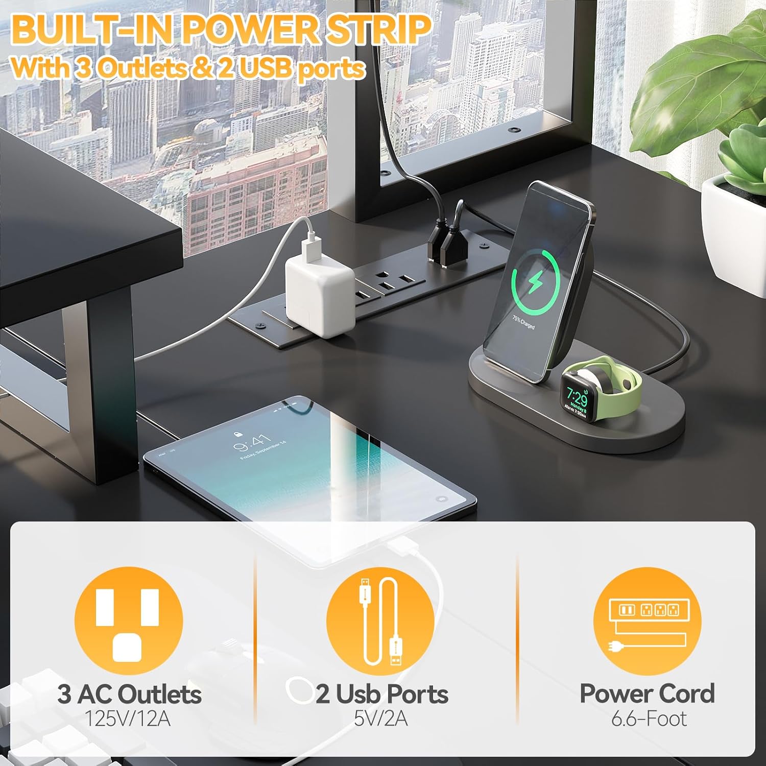 shaped desk features 3 AC outlets + 2 USB charging ports to provide power