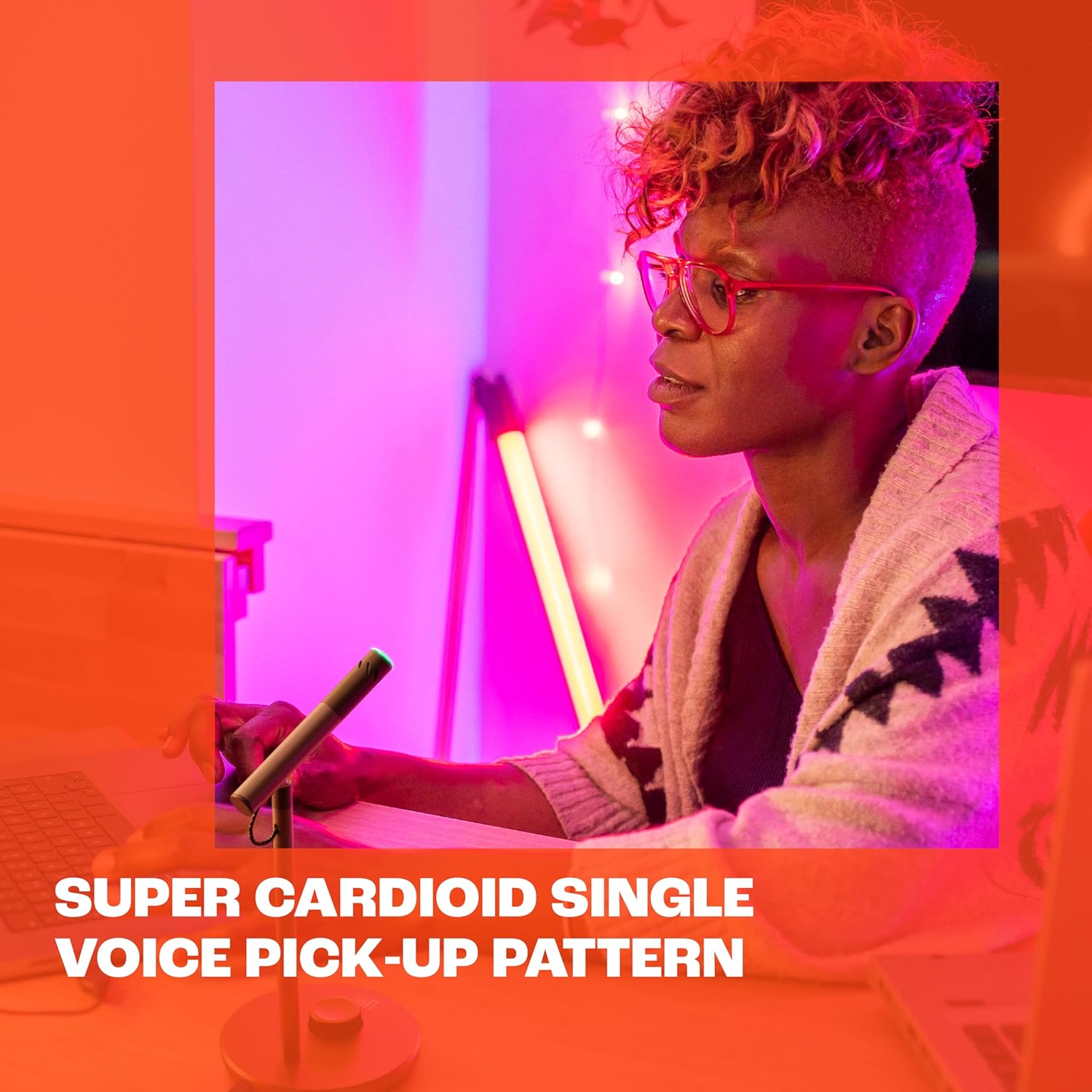 The Quantum Stream Talk from JBL is a sleek and easy-to-use USB-C microphone with an integrated desktop stand that offers crisp, intelligible speech and voice capture for gaming, streaming, and meeting applications. The mic features a single electret-condenser mic capsule with a supercardioid polar pattern that narrowly focuses the audio pickup on the person directly in front of the microphone, for less room tone and clearer speech. Plug a pair of headphones into the 3.5mm monitoring jack for monitoring and adjust the gain, headphone volume, and mute status via the single control knob.