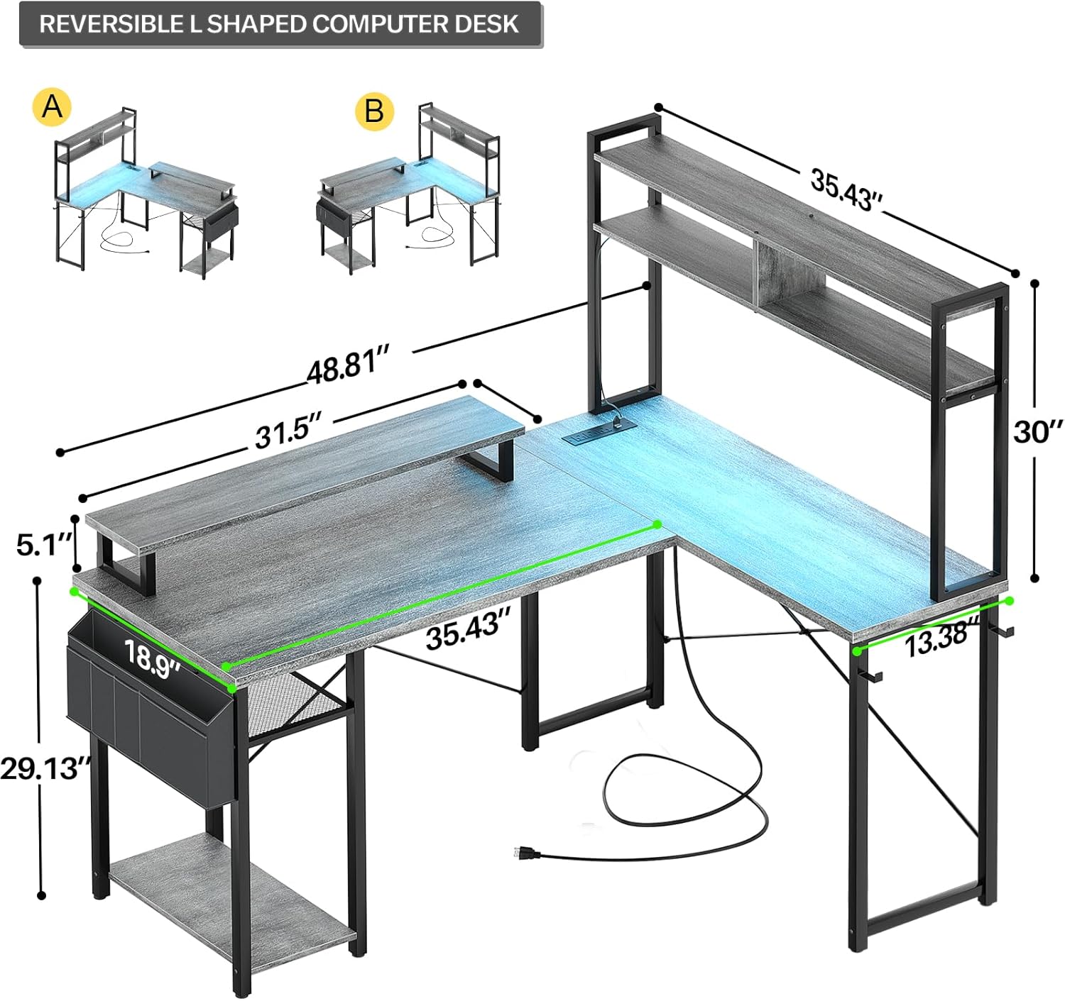 Aheaplus Small L Shaped Gaming Desk with LED Lights & Power Outlets, Reversible L-Shaped Computer Desk with Monitor Stand & Storage Shelf, Corner Desks Home Office Desk with Storage Bag.