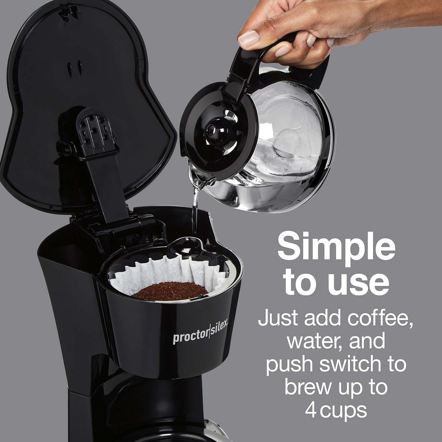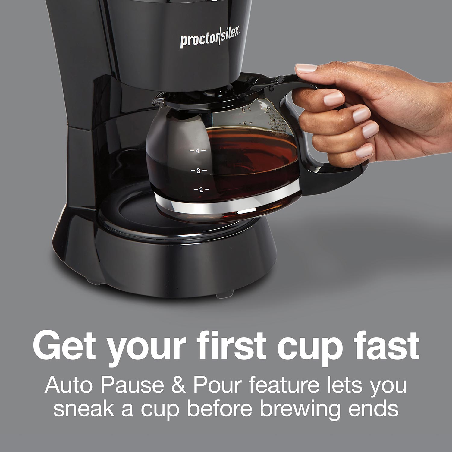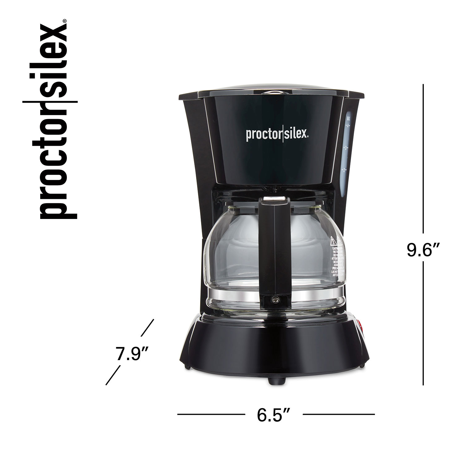 Making a pot of hot, delicious coffee couldn't be simpler with the Proctor Silex® 4 Cup Coffee Maker. Just add coffee, water, and brew with the push of one switch for great-tasting coffee without the fuss. This coffee maker features a compact, space-saving design and easily fits under cabinets. It's perfect for small kitchens and apartments yet has convenient features you'd expect in a full-size coffee maker. It's the perfect go-to coffee maker for everyday mornings, and since you only brew what you need, coffee waste is reduced. The on/off indicator light on the power switch illuminates when the coffee maker is turned on. The Auto Pause & Pour feature stops the flow of coffee when you lift the carafe so you can sneak a cup of coffee before the brewing ends without making a mess. The durable, borosilicate glass carafe and the Lift & Clean brew basket are both dishwasher safe, and the nonstick warming plate easily wipes clean. Includes a 3 year limited warranty.