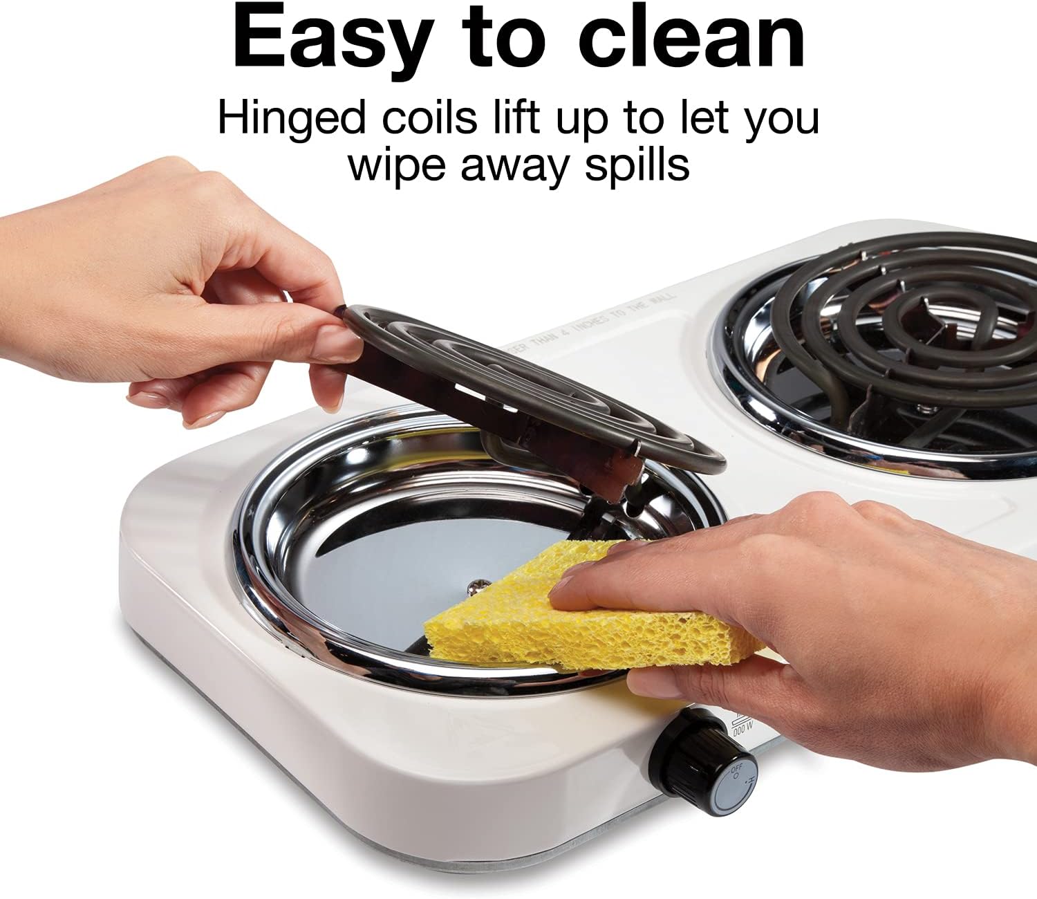 · EASY-TO-CLEAN PLATE AND HINGED 5.5 INCH DIAMETER COILS: For easy cleaning, lift up the heating coil on each burner after it cools completely to access the plate beneath. Then simply wipe away any spills or messy drips.
