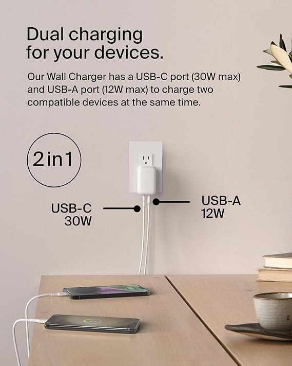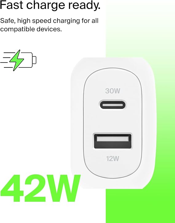 Belkin BoostCharge 42W Dual Port Wall Charger, USB-C + USB-A Charger Fast Charging - White
