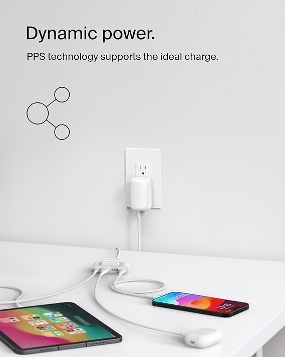 • PPS TECHNOLOGY: This dual-port wall charger is built with PPS technology, enabling the power supply to dynamically adjust the output voltage and current to be compatible with and deliver the proper amount of power to the receiving smartphone.