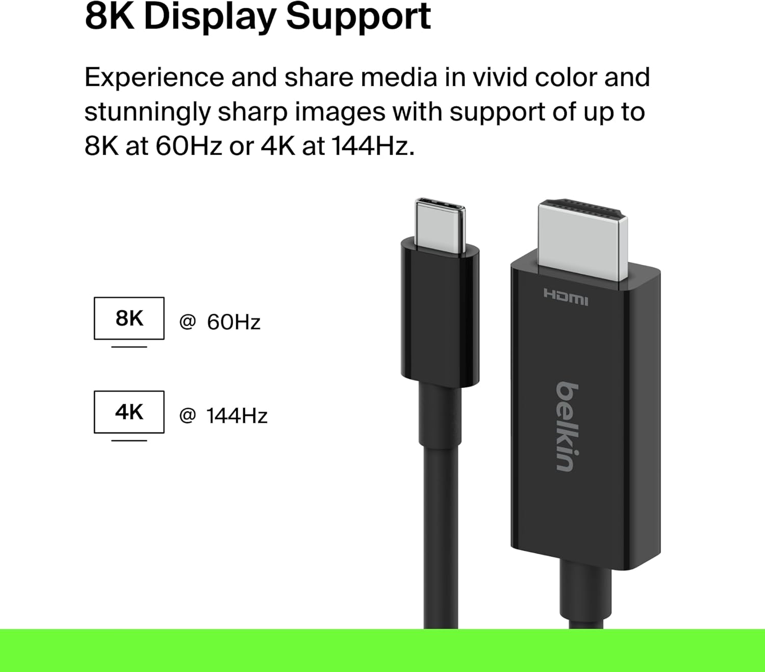 - Connect USB-C devices and laptops to an HDMI display with our USB-C to HDMI Cable to get vividly sharp HDR and up to 8K resolution at 60Hz and 4K at 144Hz.