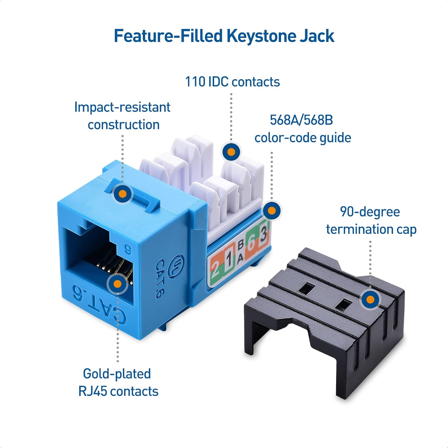 - 10 Gigabit Ethernet with Cat 6 Ethernet cables terminated into this Cat6 keystone jack; Ethernet keystone jack is backwards compatible with a 10/100 Ethernet network and Cat5e cable; Meets or exceeds Category 6 performance in compliance with the ANSI/TIA/EIA 568-C.2 standard.