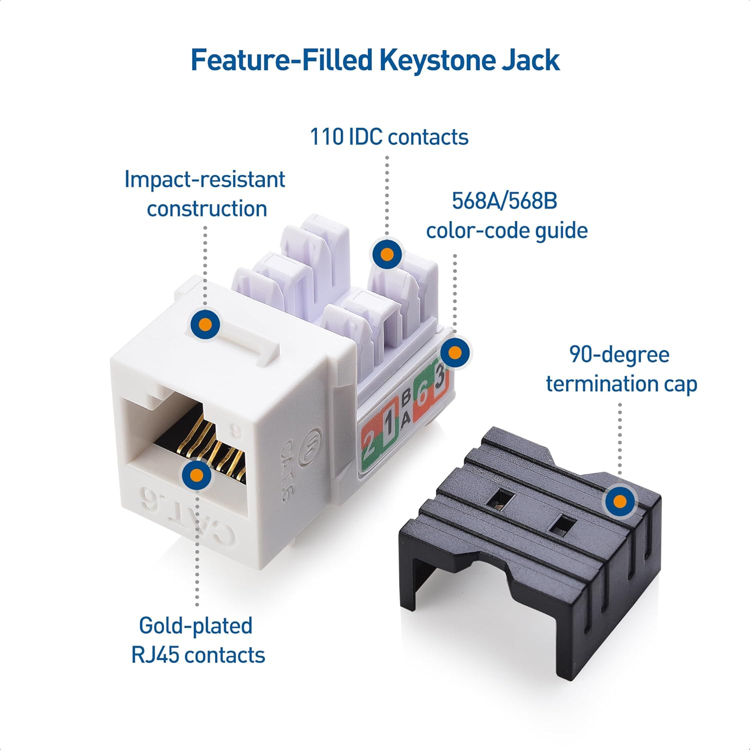 - UL listed Heavy duty keystone jack with T568A and T568B color-coded labels; Category 6 rated performance up to Gigabit Ethernet speeds for a fast and reliable network; Supports T568A and T568B wiring with 110-style, color-coded termination blocks; Heavy duty construction includes an impact-resistant and fire-retardant housing with gold-plated RJ45 contacts, IDC covers, and a snap-in retaining clip for a secure connection.