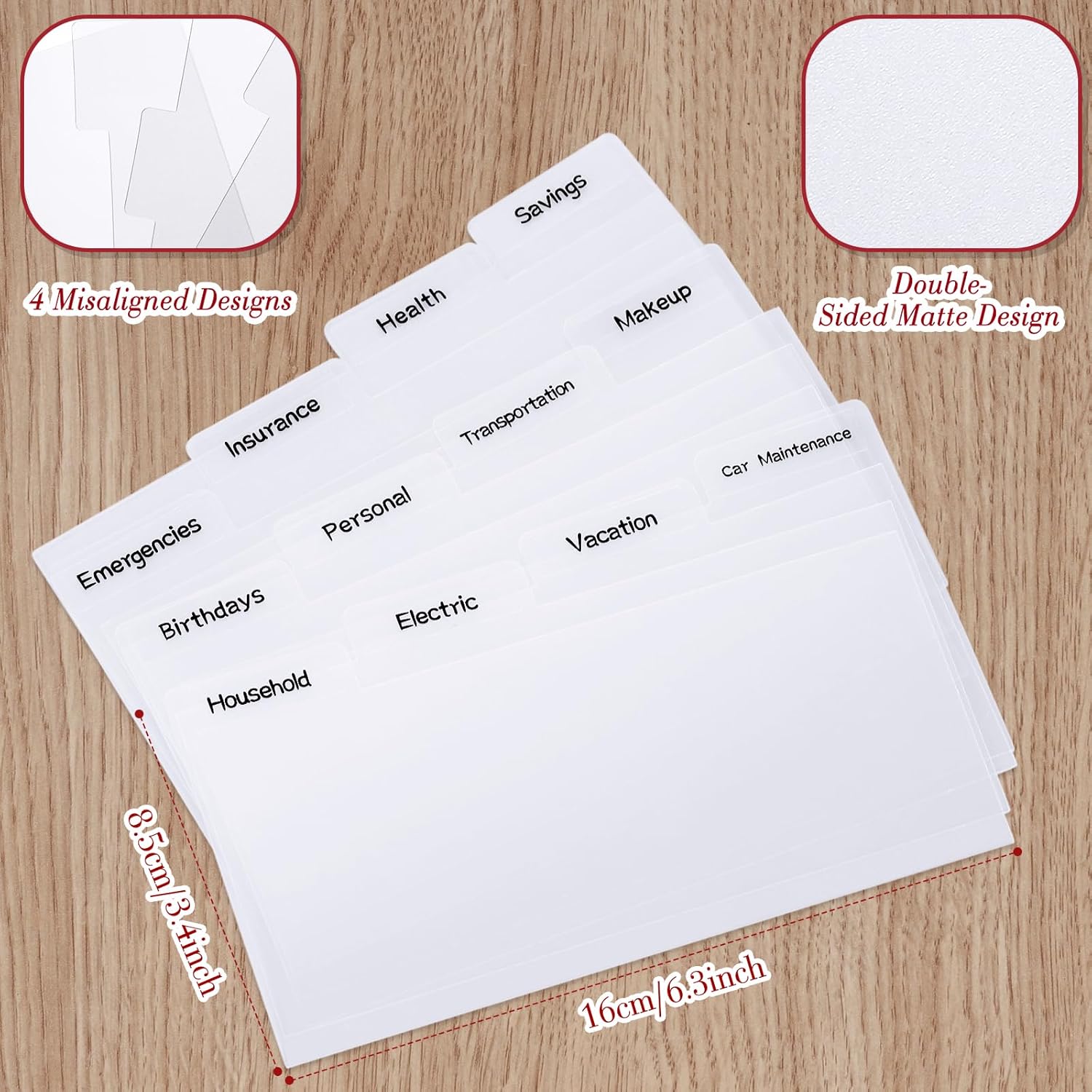 - Cash dividers: the size of a single cash divider is about 6.3 x 3.4 inches. The cash dividers are made of double sided matte plastic materials; There are 4 types of misplaced tabbed dividers, 2 pieces for each type, 8 pieces in total; At the top of the cash dividers, you can paste the corresponding budget items according to your needs; They will help you distinguish each type of money, so that your wallet is organized and no longer messy