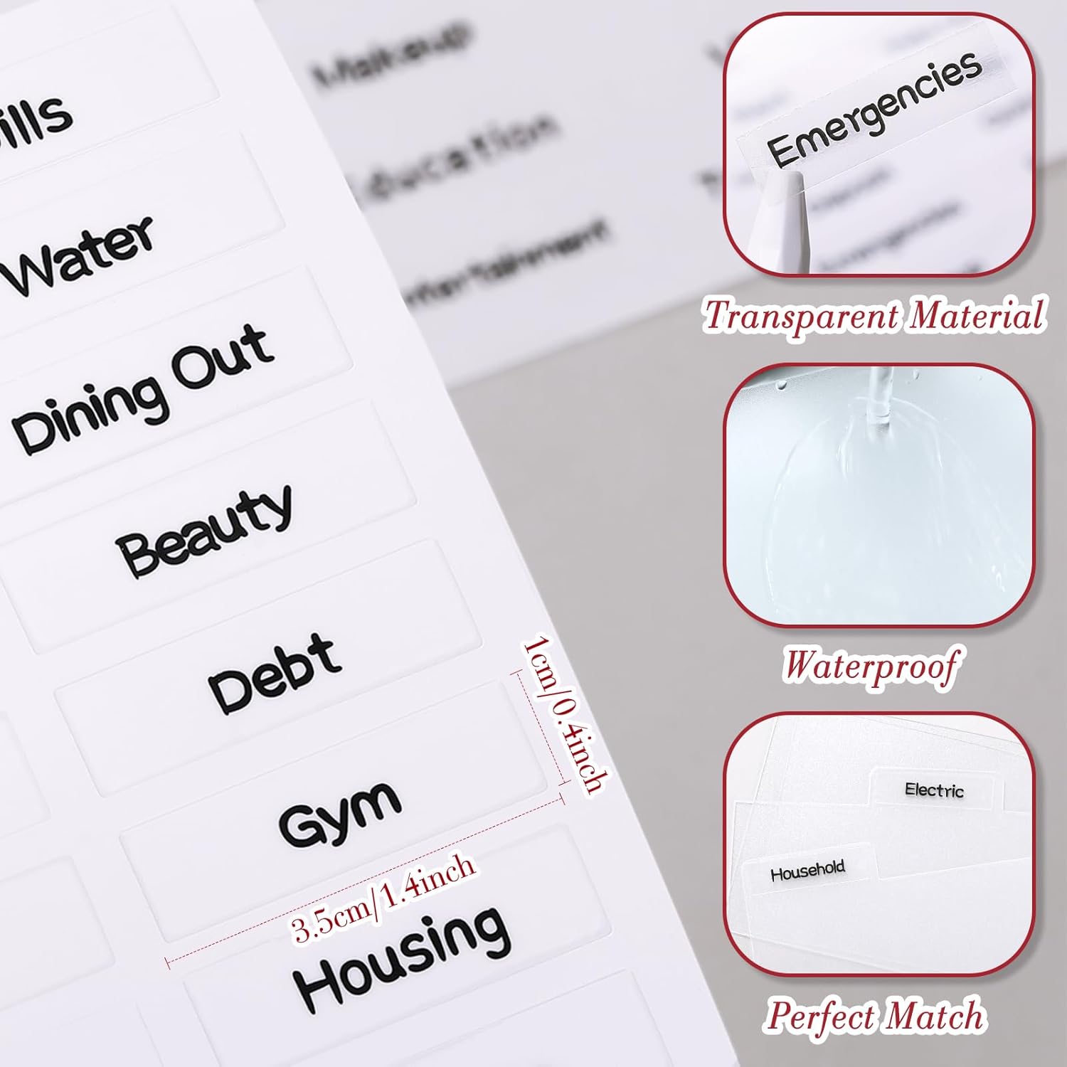 - Tab stickers: 40 pieces of budget items have been handpicked, covering the large and small money classifications in life; The classifications are complete to help you manage and subdivide each type of expense; There are 2 sheets in total, to meet your classification needs and quantity needs at the same time. The size of a single sticker is about 1.4 x 0.4 inches.