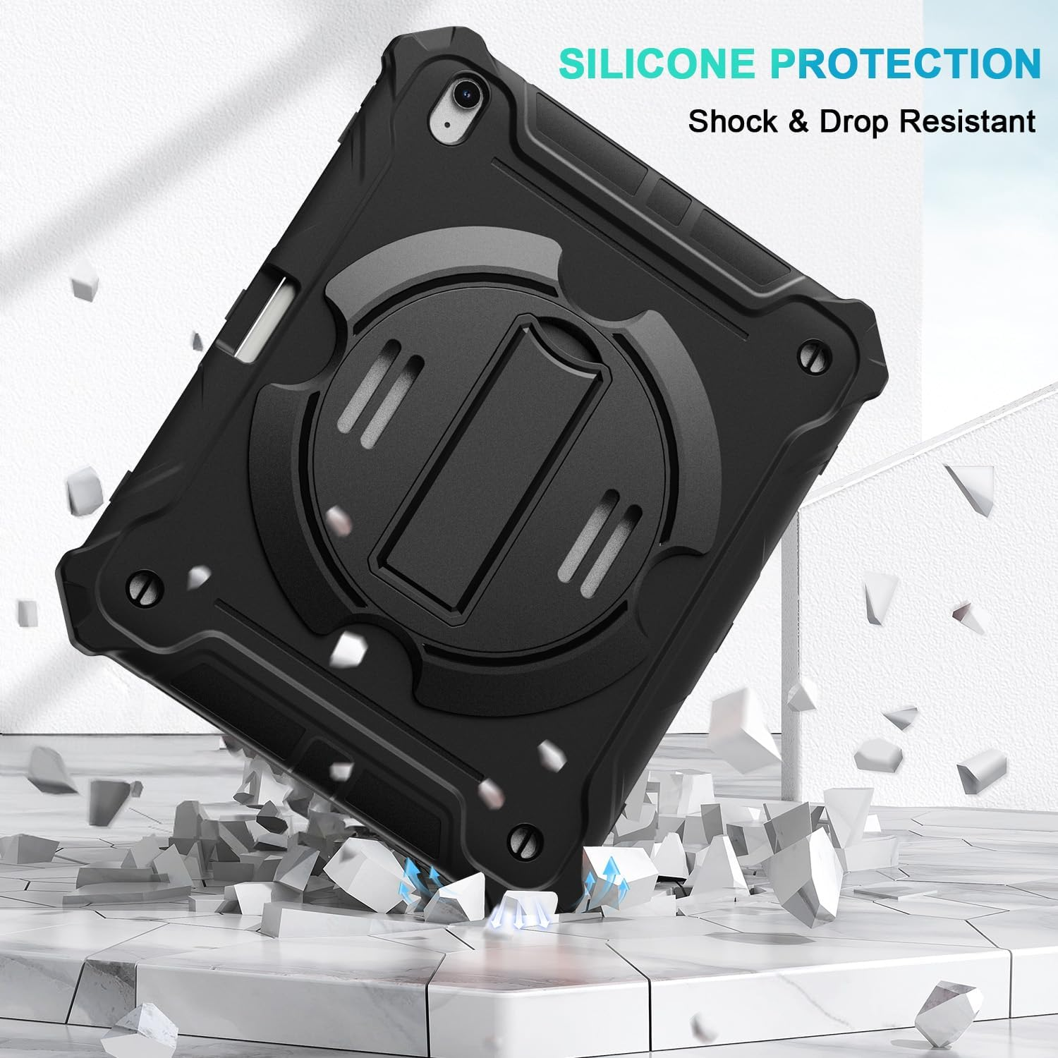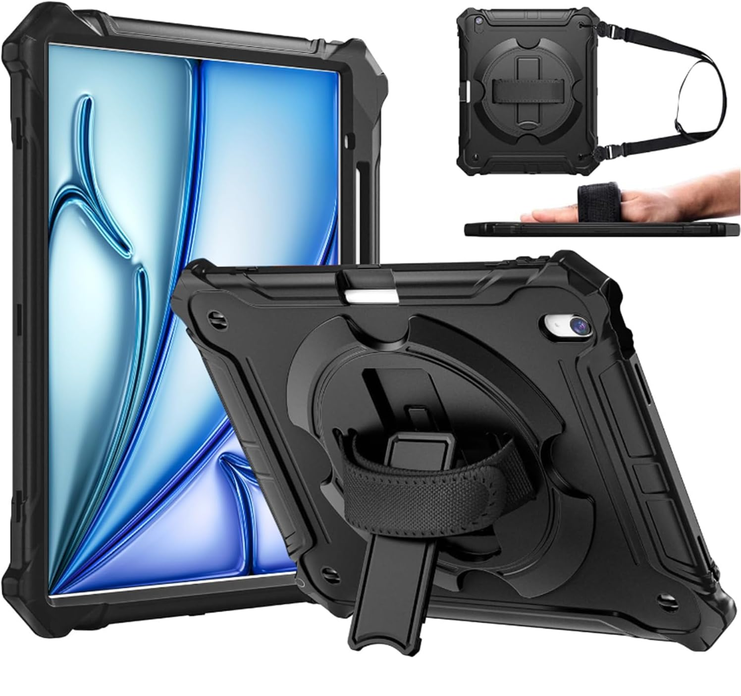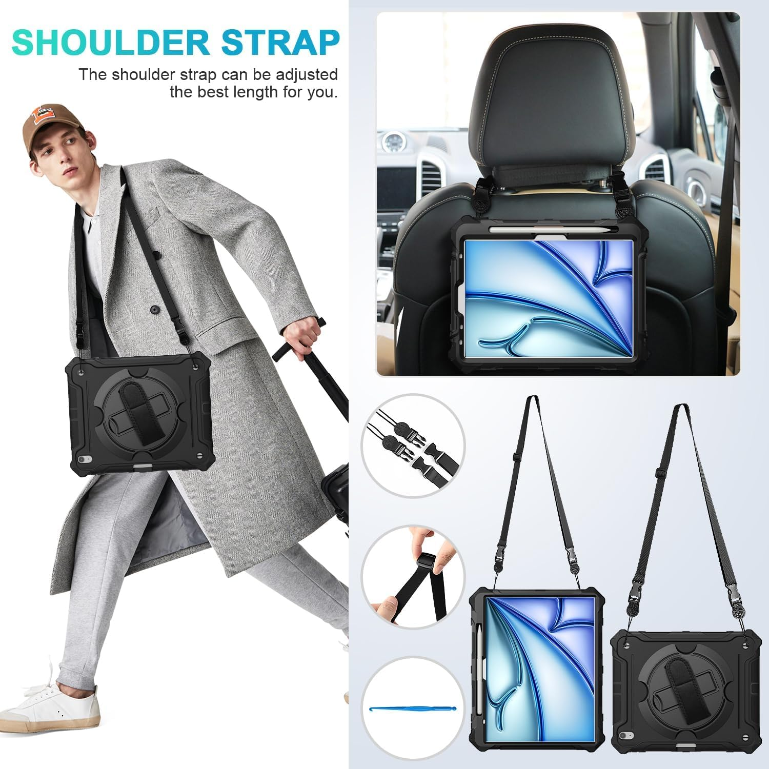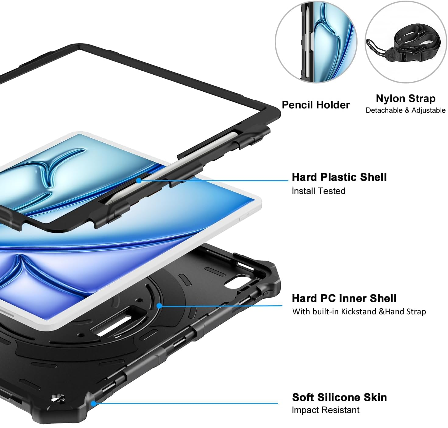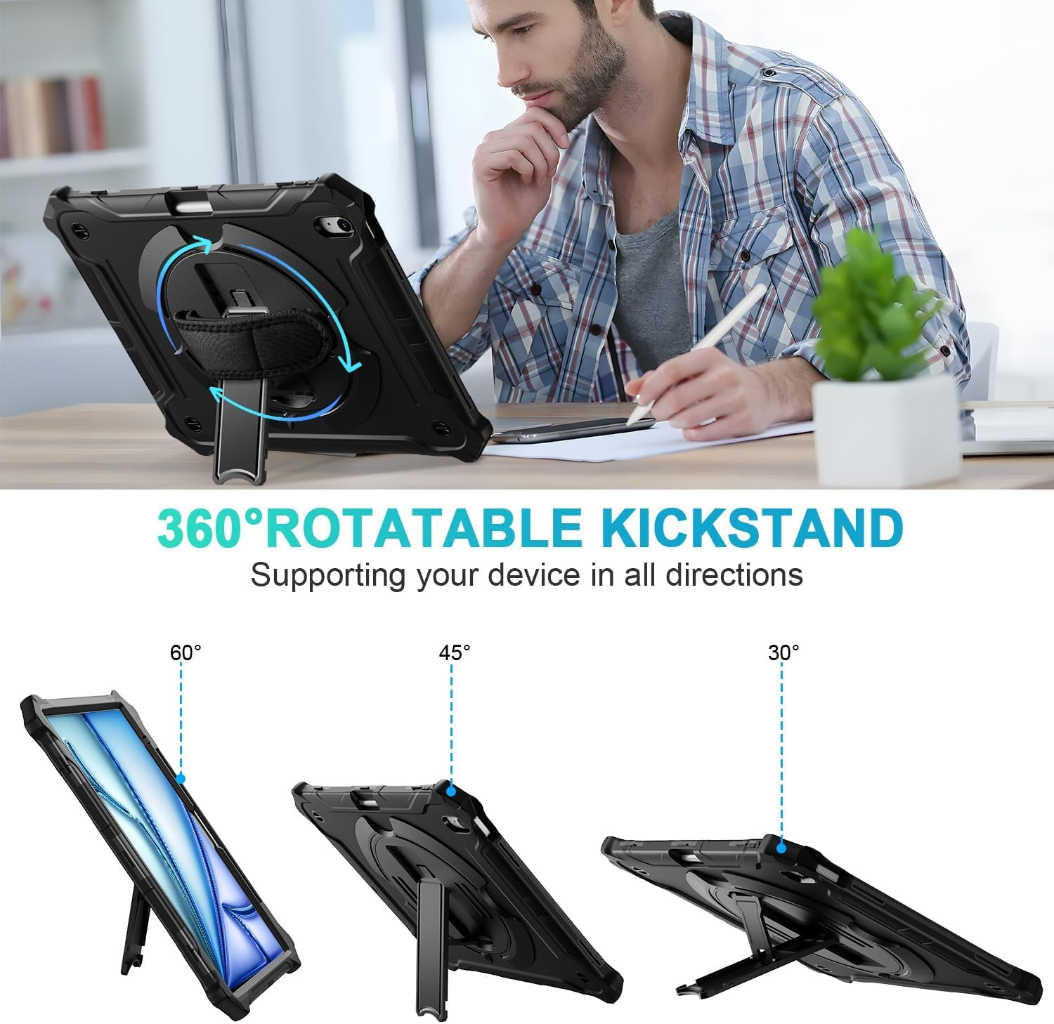 IPad Air 13 inch (M2) Case 2024 with Pencil Holder, Shockproof Full Body Drop Protective Cover with 360° Rotating Hand Strap & Stand - Black
