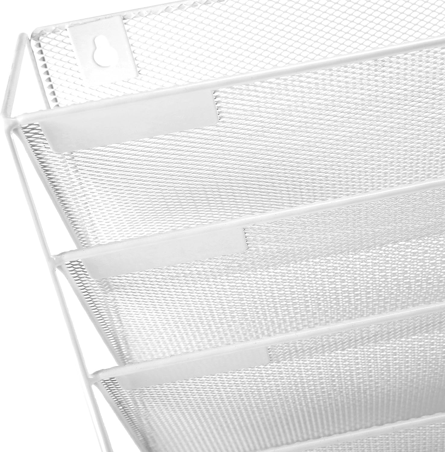 Wall Mounted Mesh Metal Office Document File Folder Magazine Holder Rack Hanging Filing System with Bottom Storage Shelf with 5 Slanted Slots - White