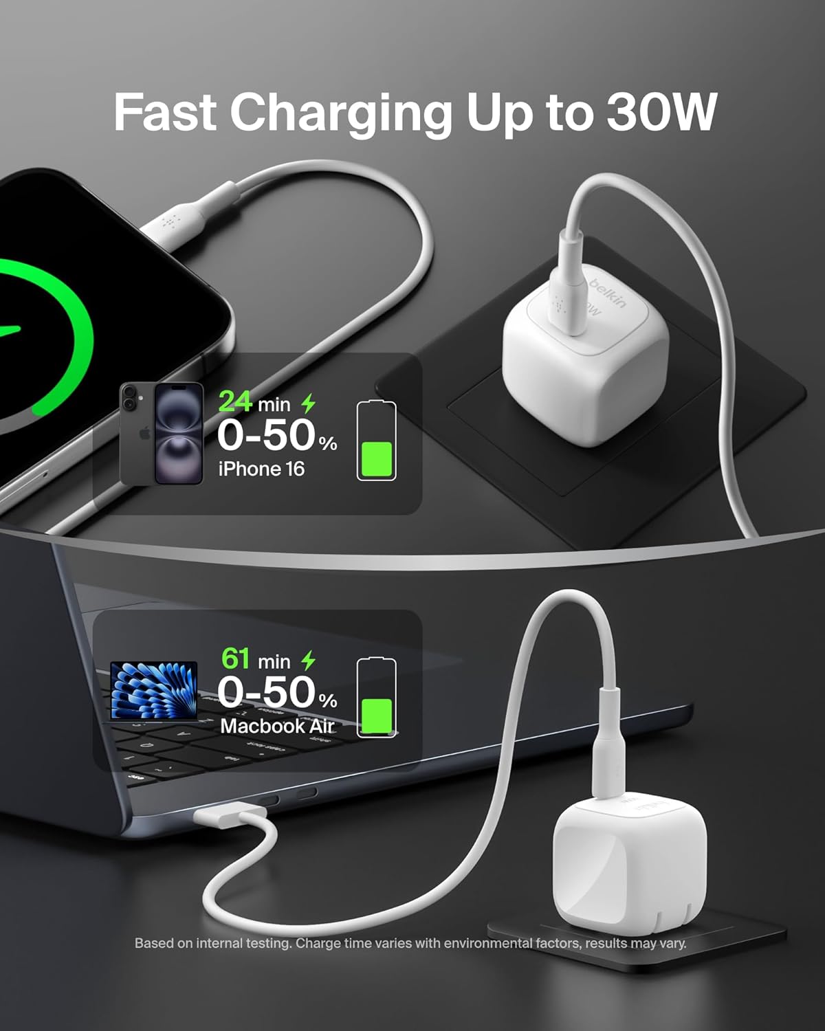 - USB-C FAST CHARGING TECHNOLOGY: This compact charger's 30W Power Delivery supports fast charging of various devices such as your smartphone and even a tablet. Rapidly charge an iPhone 16 from 0-50% in just 24 minutes.