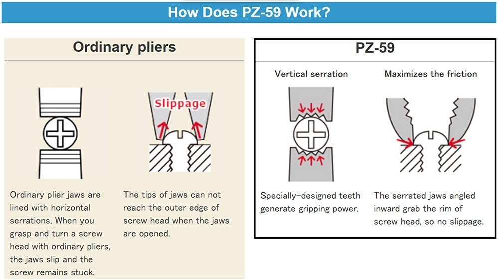 • specially shaped & uniquely serrated gripping jaws - unlike other pliers, these screw pliers won't slip