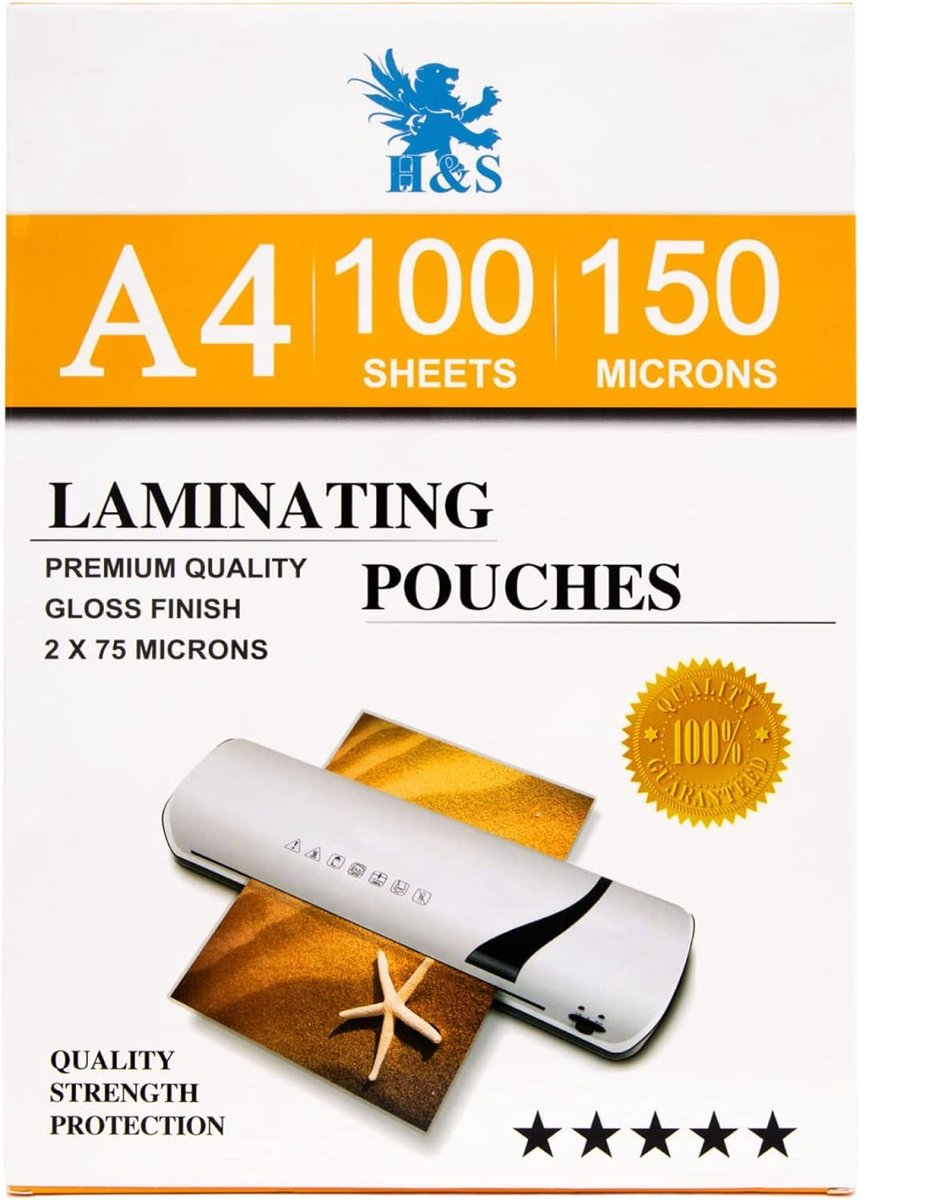 H&S A4 laminating pouches 100 pieces 150 micron - 2 x 75 micron - Glossy laminating pouch - Waterproof up to 150 micrometer 75 per side - Suitable for all common laminating machines