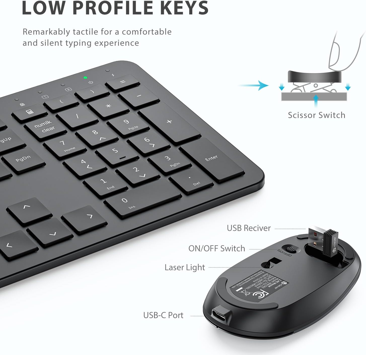 - RESPONSIVE AND LOW PROFILE KEYS - For people who care about precision typing, the highly responsive scissor switches in this wireless keyboard will make them feel right at home. It types quietly, and the increased stability of the buttons lower tip noise and make them even more accurate. You can feel every keystroke on this wireless keyboard and mouse, but you don't need to hear it! Bottom of keyboard is designed with anti-slide pads so it will stay in place when you're typing quickly.
