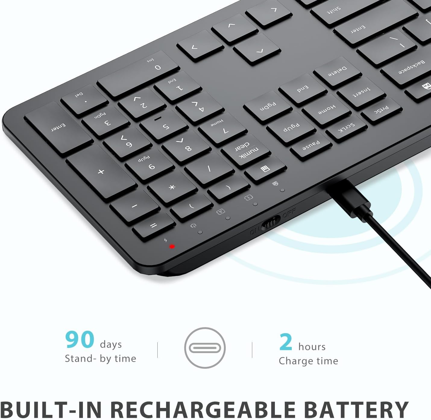 - RECHARGEABLE BATTERY SAVES ENERGY - Forget the annoyance of having to change batteries with this wireless keyboard, which uses a lithium-ion battery to give you up to 90 hours of continuous use on a single charge. When you're not using them, both the mouse and keyboard will go on standby to save energy. Just click the mouse or hit any key of the wireless keyboard to wake them up (the mouse is powered by 2 AAA batteries, not included).