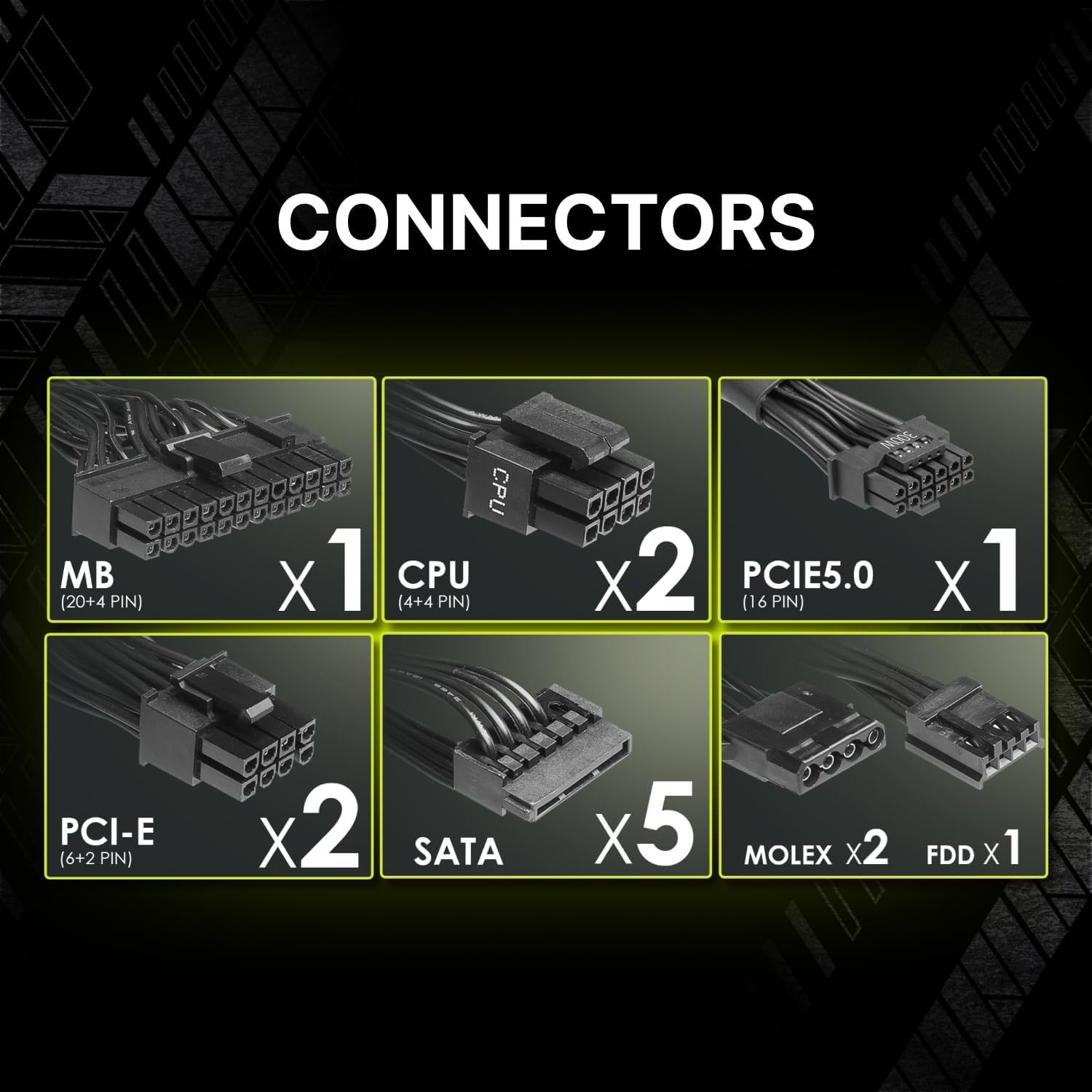 the standard 24-pin and EPS 4+4-pin connectors. You also get two PCIe 6+2-pin,