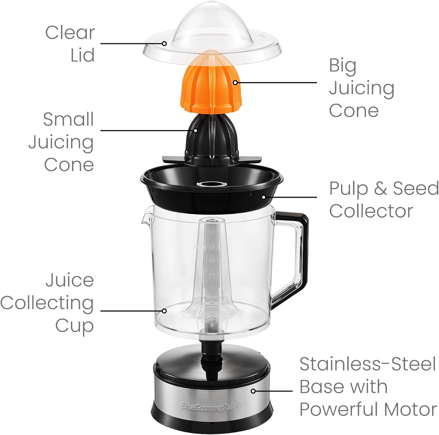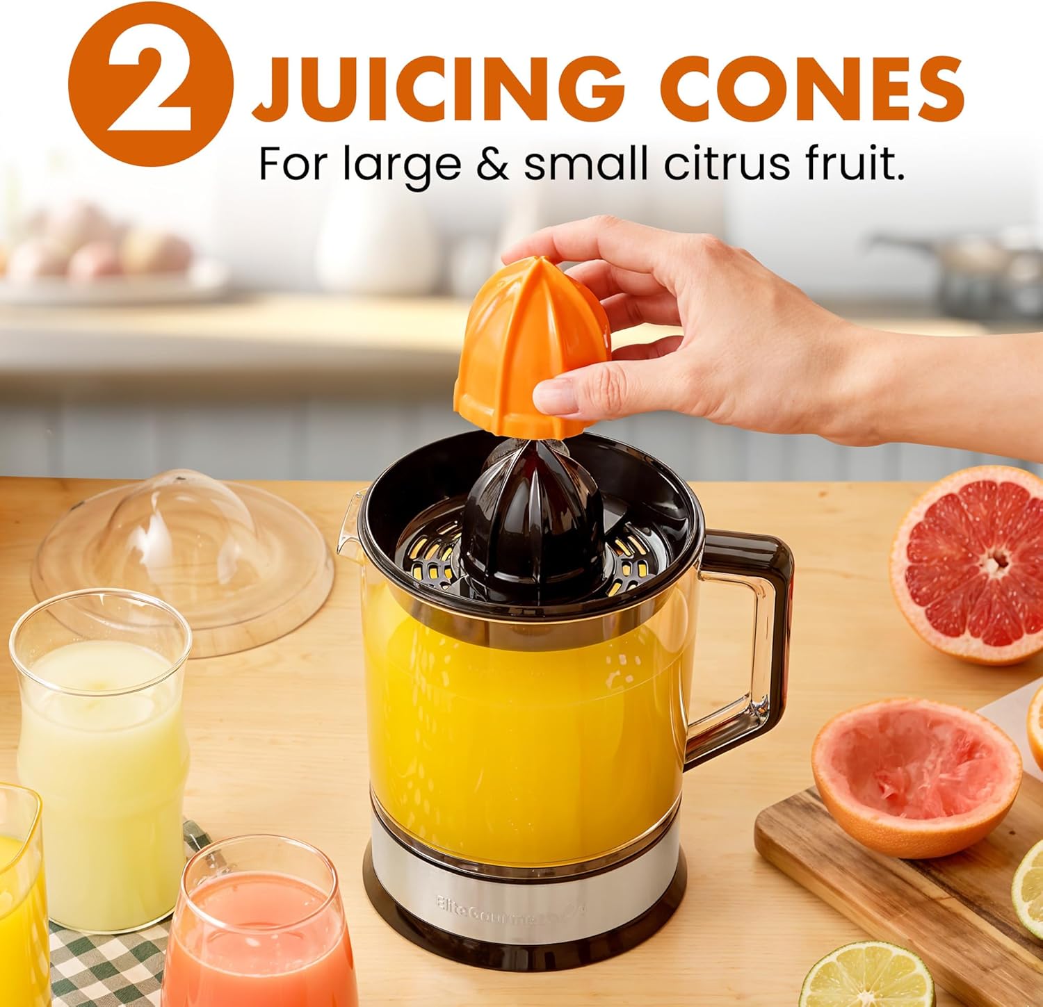 Elite Gourmet BPA-Free Electric Citrus Compact Juicer with 2 Cones & Pulp Control - 1.2L