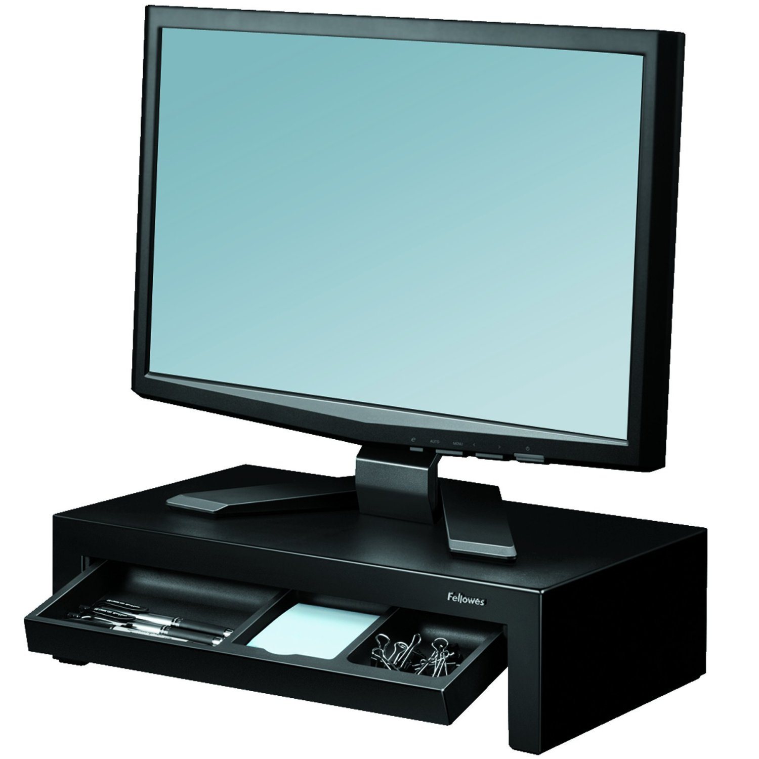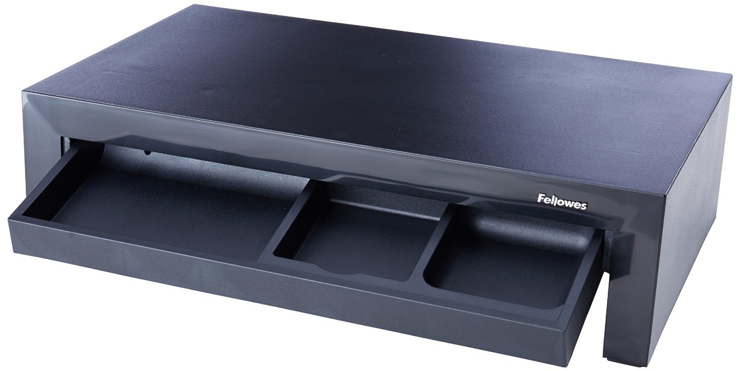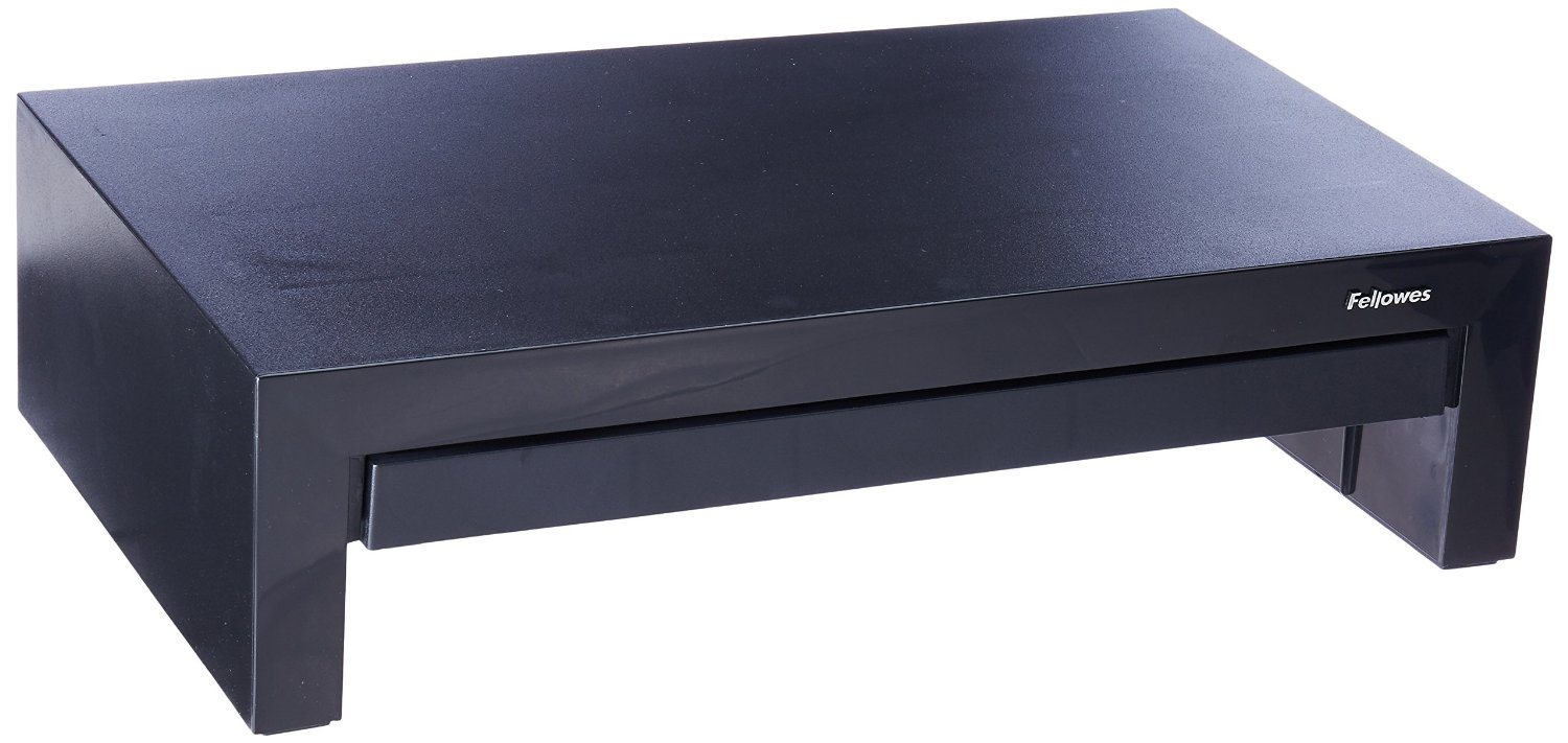 The Fellowes Designer Suites Monitor Riser features three height adjustments to prevent neck and shoulder strain! Unit raises monitor to comfortable viewing height while maximizing workspace. Supports monitors up to 21" or 40 lbs. and offers height adjustments up to 1-5/8” (between 4-3/8” and 6”) for optimal viewing angle. Storage tray organizes essentials such as pens and paper clips. Includes non-skid rubber feet to protect work surface from scratches or scuffs. Raises monitor to comfortable viewing height and maximizes workspace