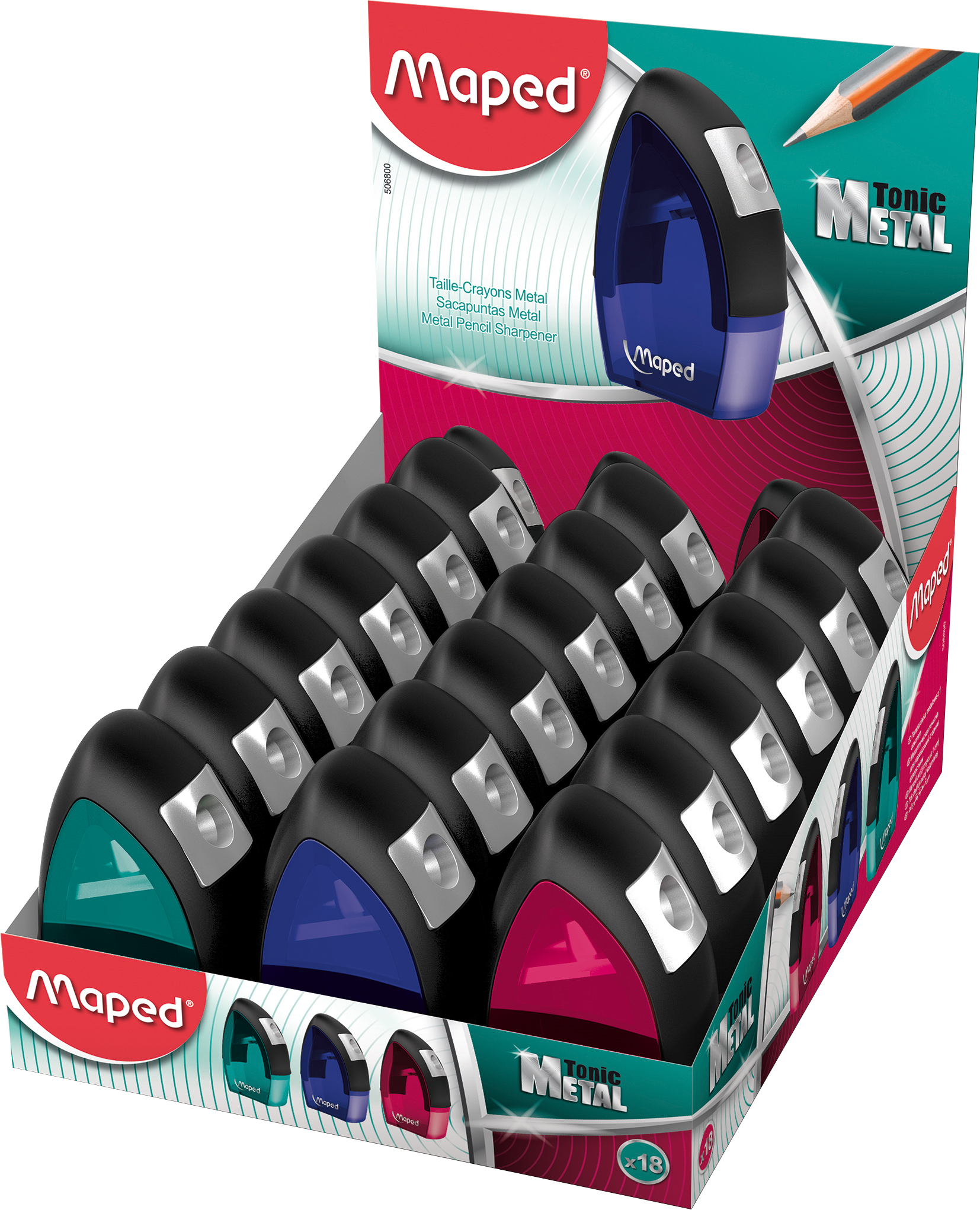Metal sharpener with transparent tray. Assorted transparent colors: pink, green and blue.