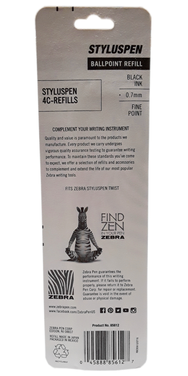 Zebra StylusPen Twist Ballpoint Pen 4C Refill, Fine Point, 0.7mm, Black Ink, 2-Count