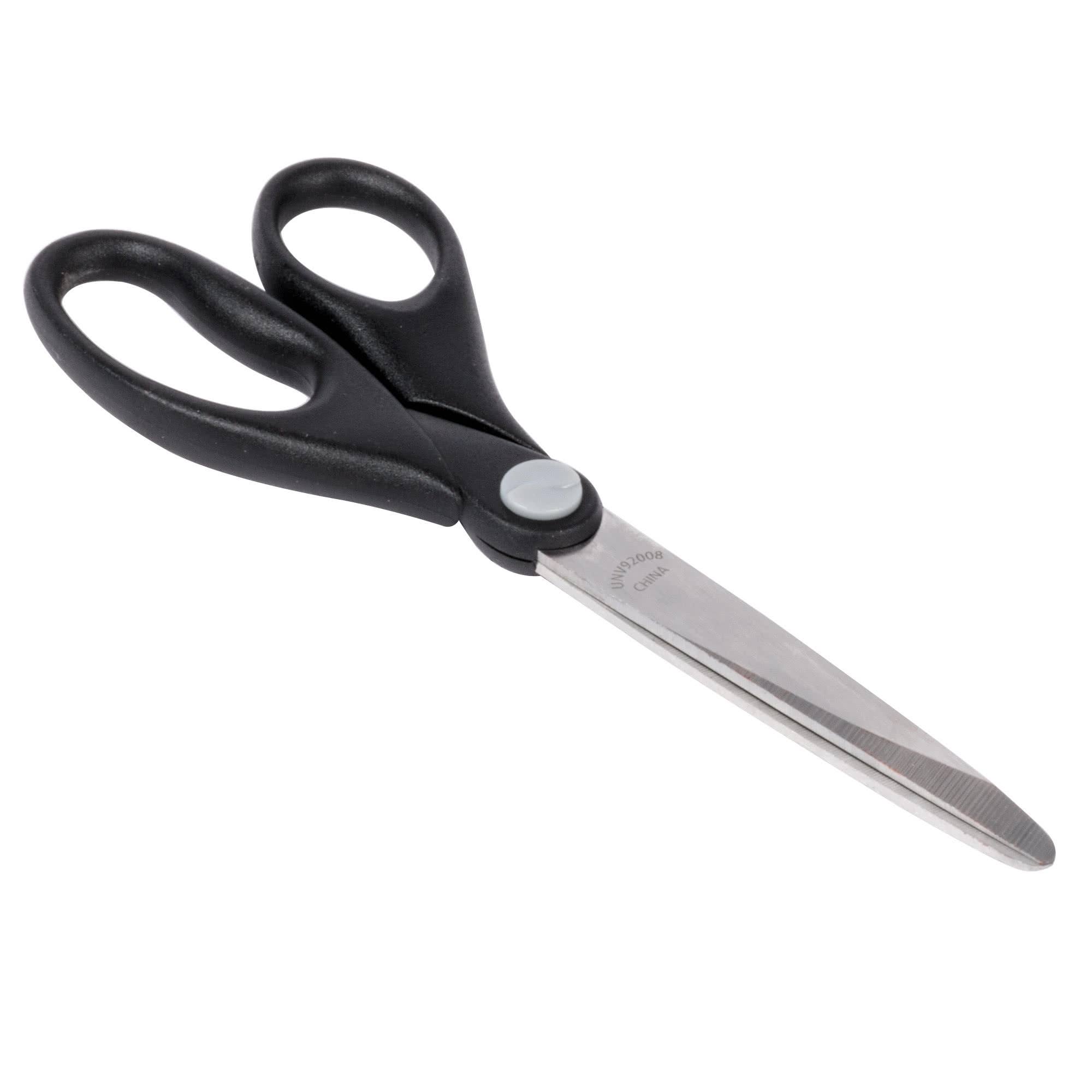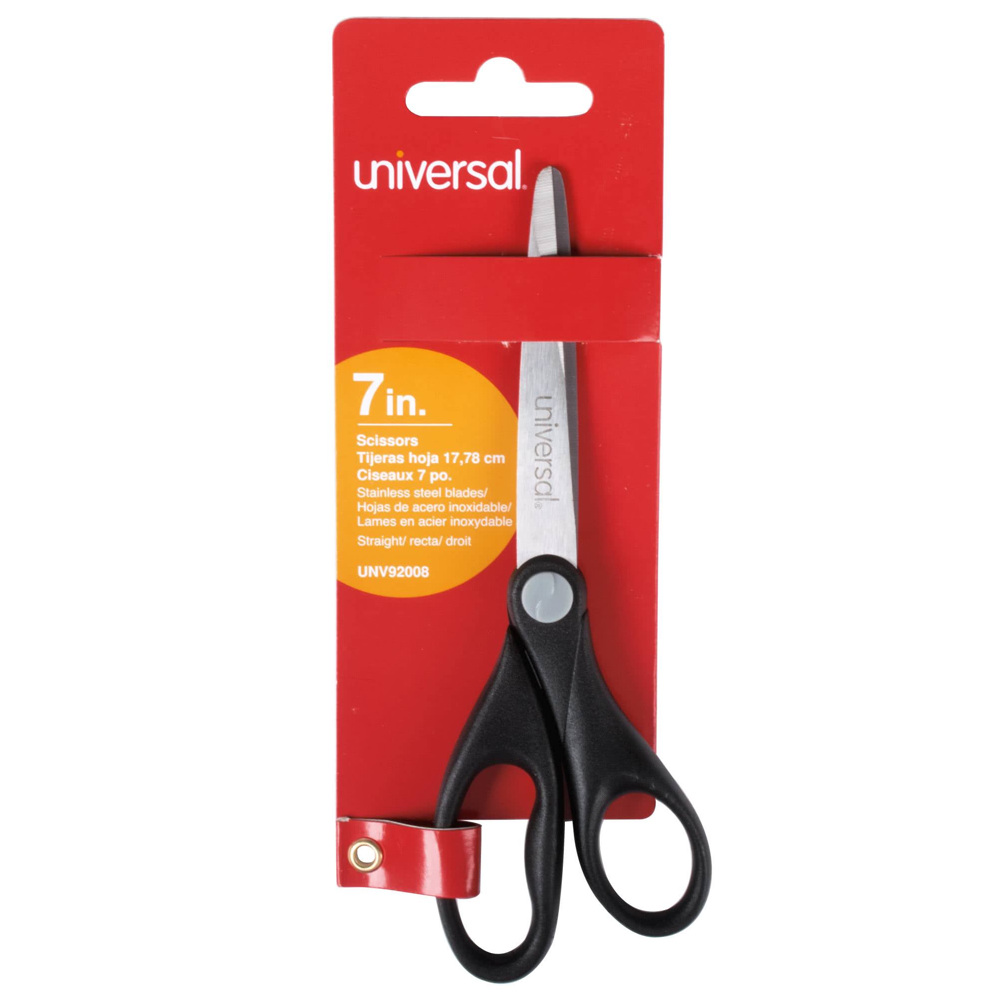 - Easily cut everything from thin film to tough cardboard with these Universal UNV92008 7" stainless steel economy scissors with black straight handle!