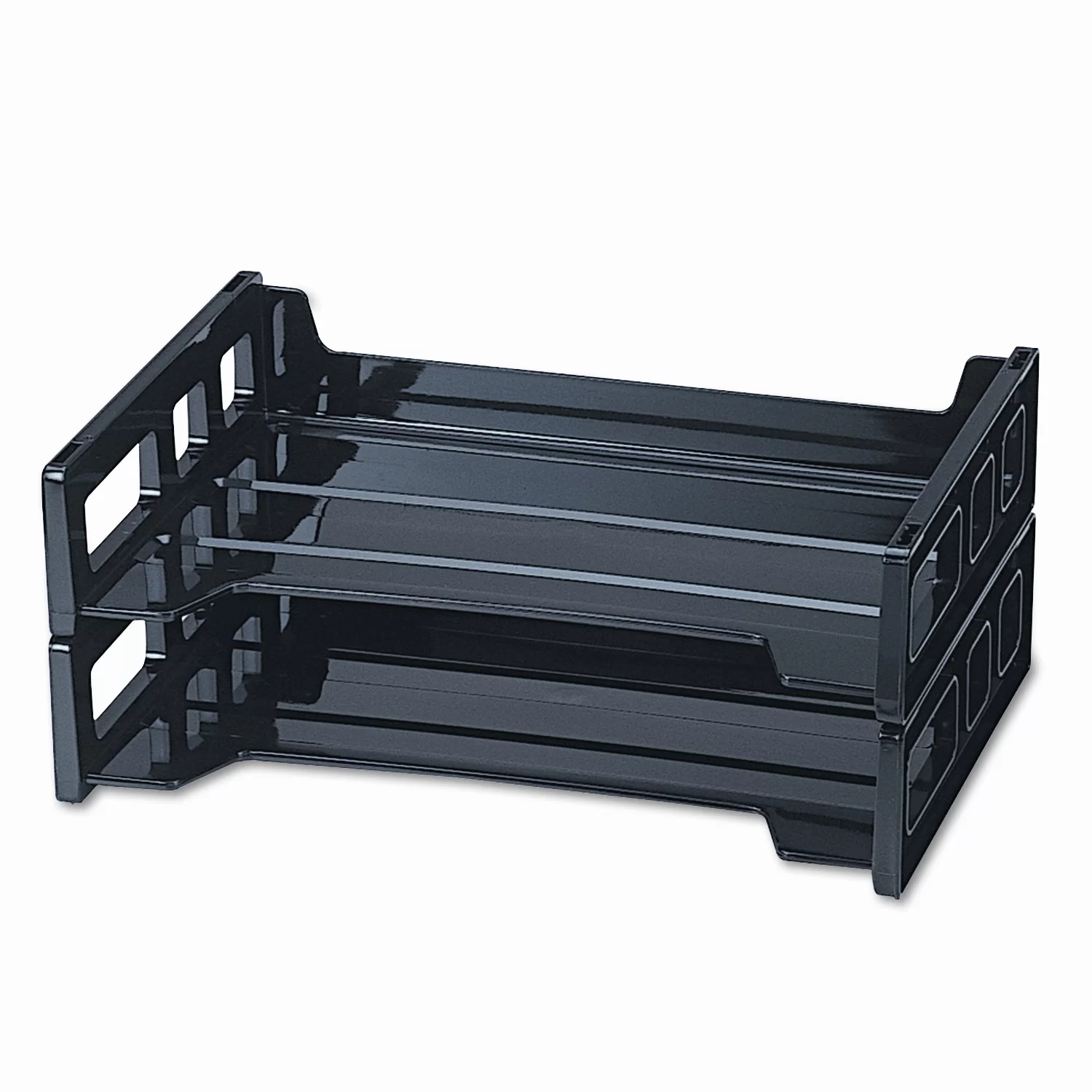- Universal Side Load Letter Desk Tray, Two Tier, Plastic, Black Simple meets smart in this solution to document management. Ribbed design prevents static build-up so papers glide easily in and out of trays. Self-stacking. 2 3/4" high. Two trays per pack. Desk Tray Type: Two-Tier Side Load; Holds Paper Size: Letter; Width: 13"; Depth: 9". Sturdy construction.