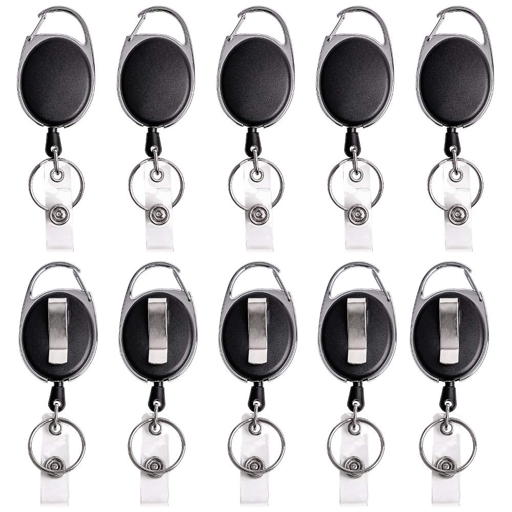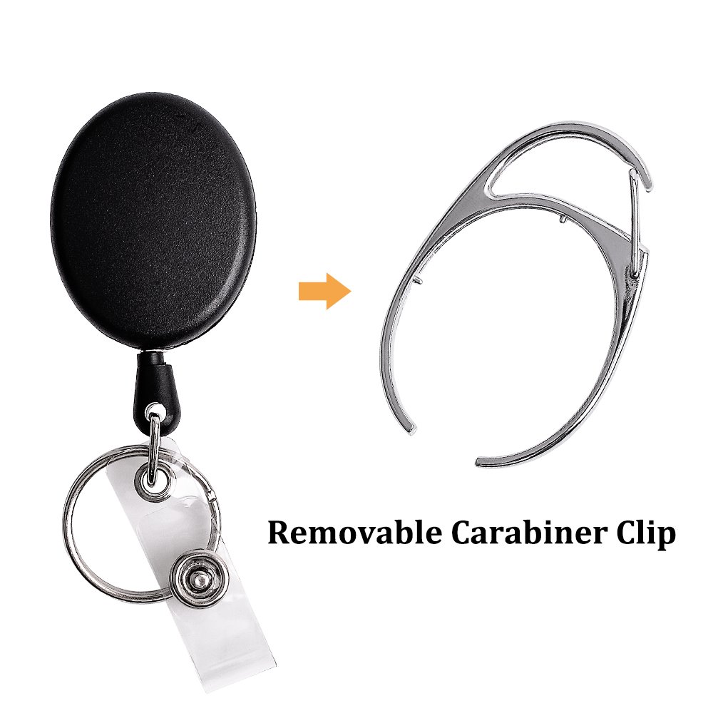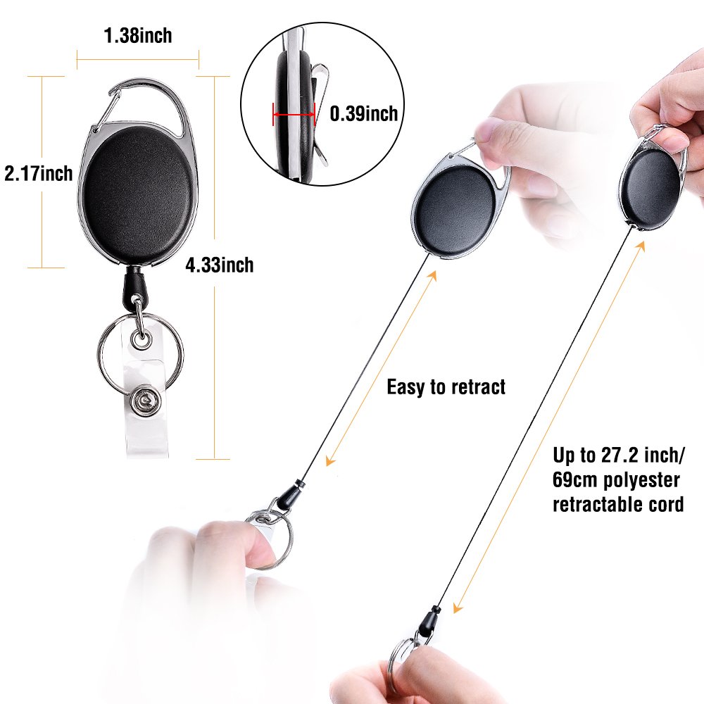 - UNIQUE DESIGN- This carabiner badge reel has two attachment choices- a carabiner and a belt clip which make it easy to secure to belt loop, backpack, purse, pocket and so on. This clip badge holder retractable is with key ring which can hold up to 12 keys